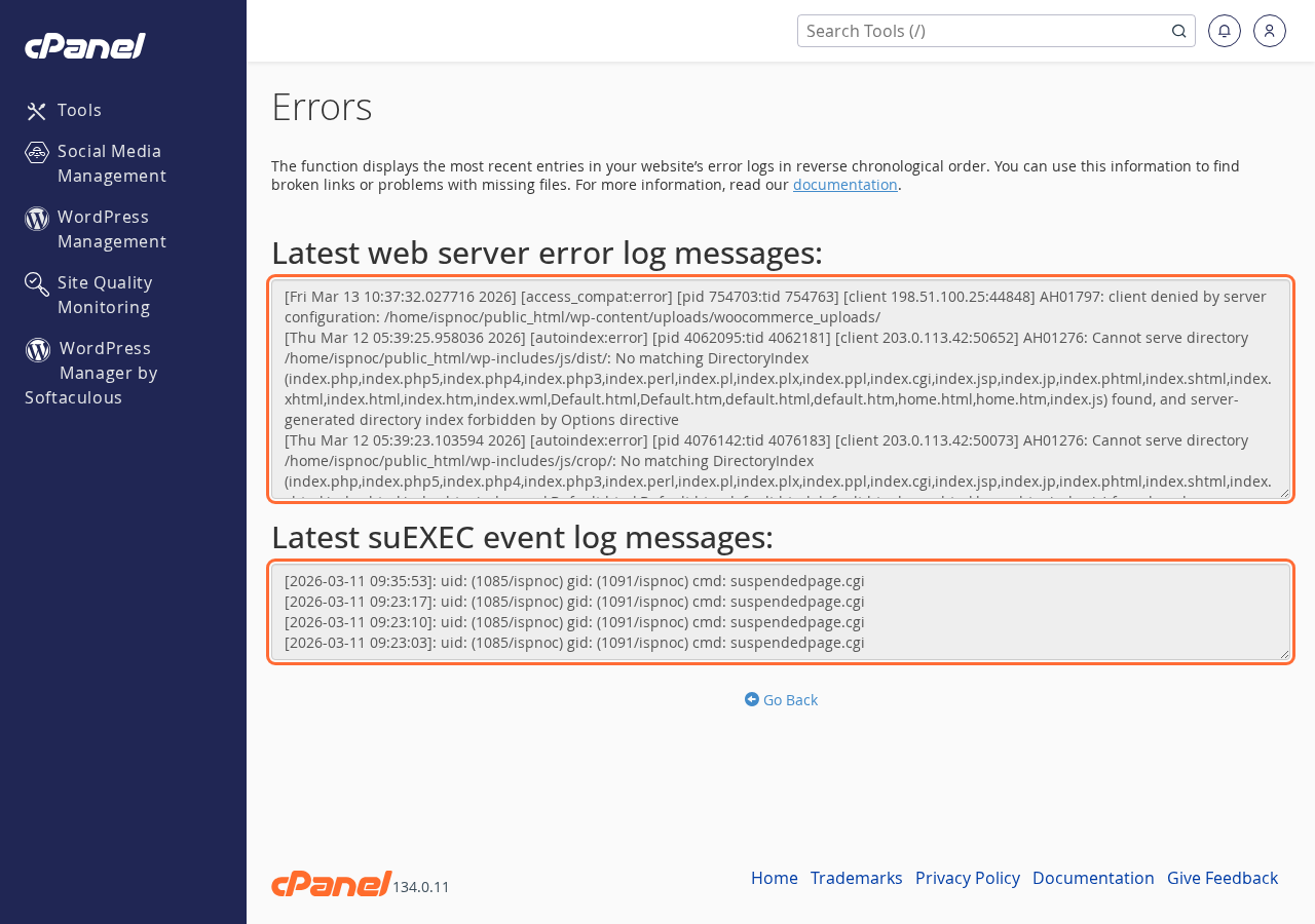 The error log shows the most recent entries from your website's Apache error log. This is useful for finding broken links, missing files, PHP errors, and permission problems.