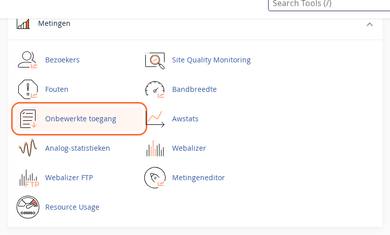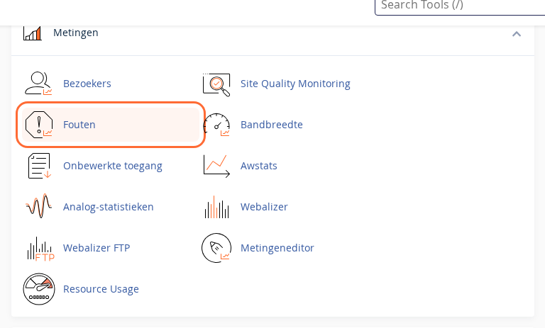 Je kunt deze tools ook snel vinden via de zoekbalk bovenaan cPanel. Typ fouten of onbewerkte toegang en klik op het juiste resultaat.