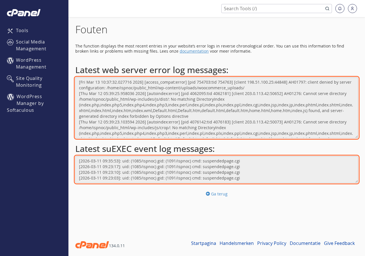 De errorlog toont de meest recente meldingen uit de Apache-errorlog van je website. Dit is handig om gebroken links, ontbrekende bestanden, PHP-fouten en permissieproblemen te vinden.