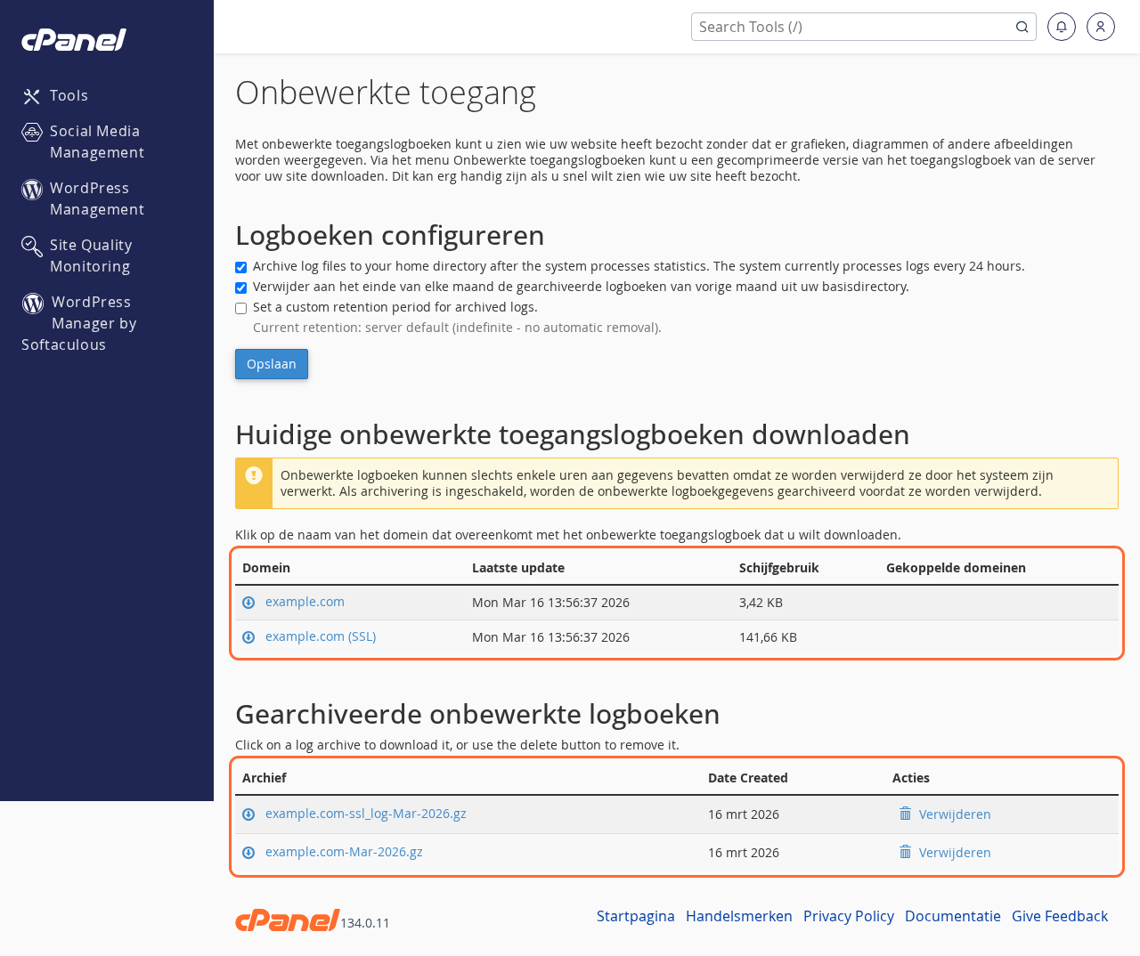 Hier kun je instellen of je logs gearchiveerd moeten worden en hoe lang ze bewaard blijven. Standaard archiveert cPanel je logs elke 24 uur naar je homedirectory en verwijdert de gearchiveerde logboeken van de vorige maand aan het einde van elke maand. Klik op Opslaan als je iets aanpast.